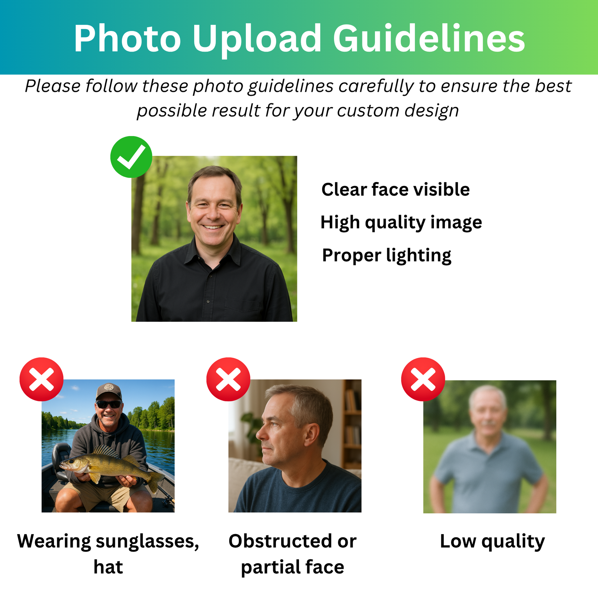 Since our artists manually customize each face and every photo differs in lighting, angle, and quality, we’re unable to provide an instant preview before purchase.