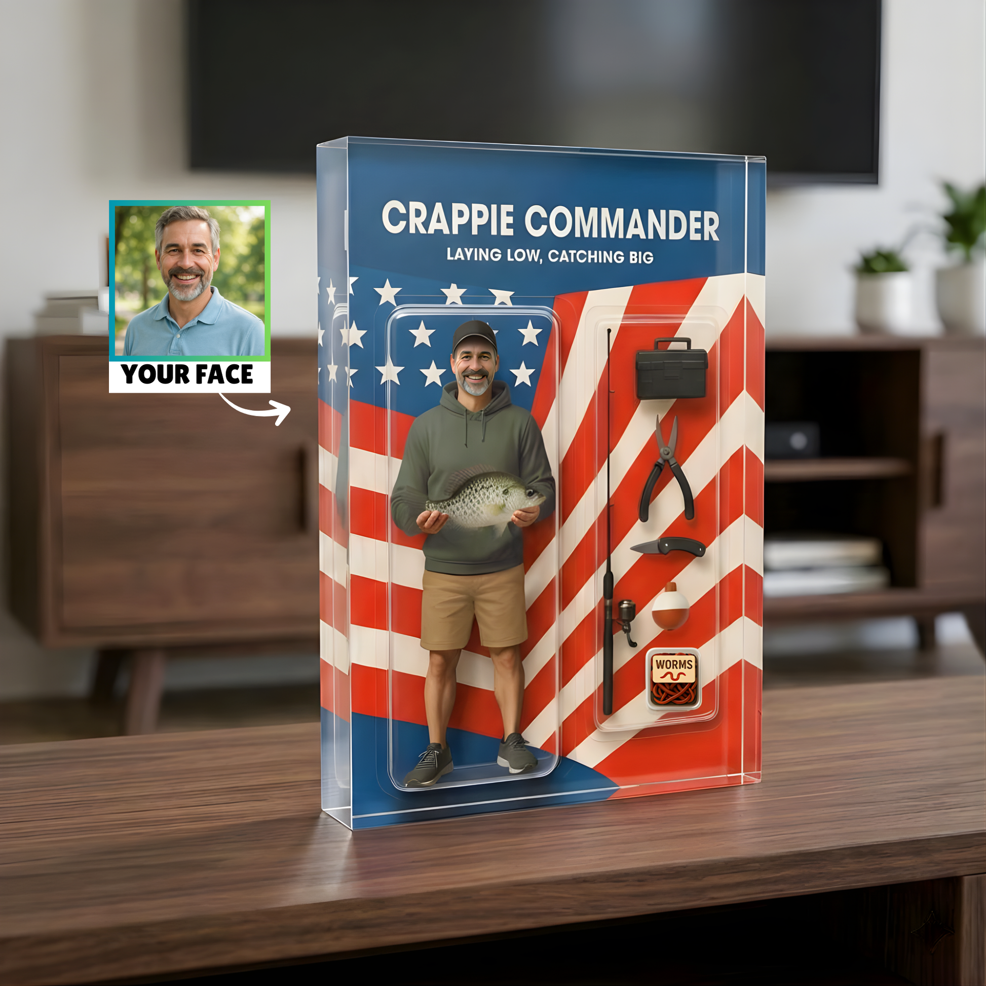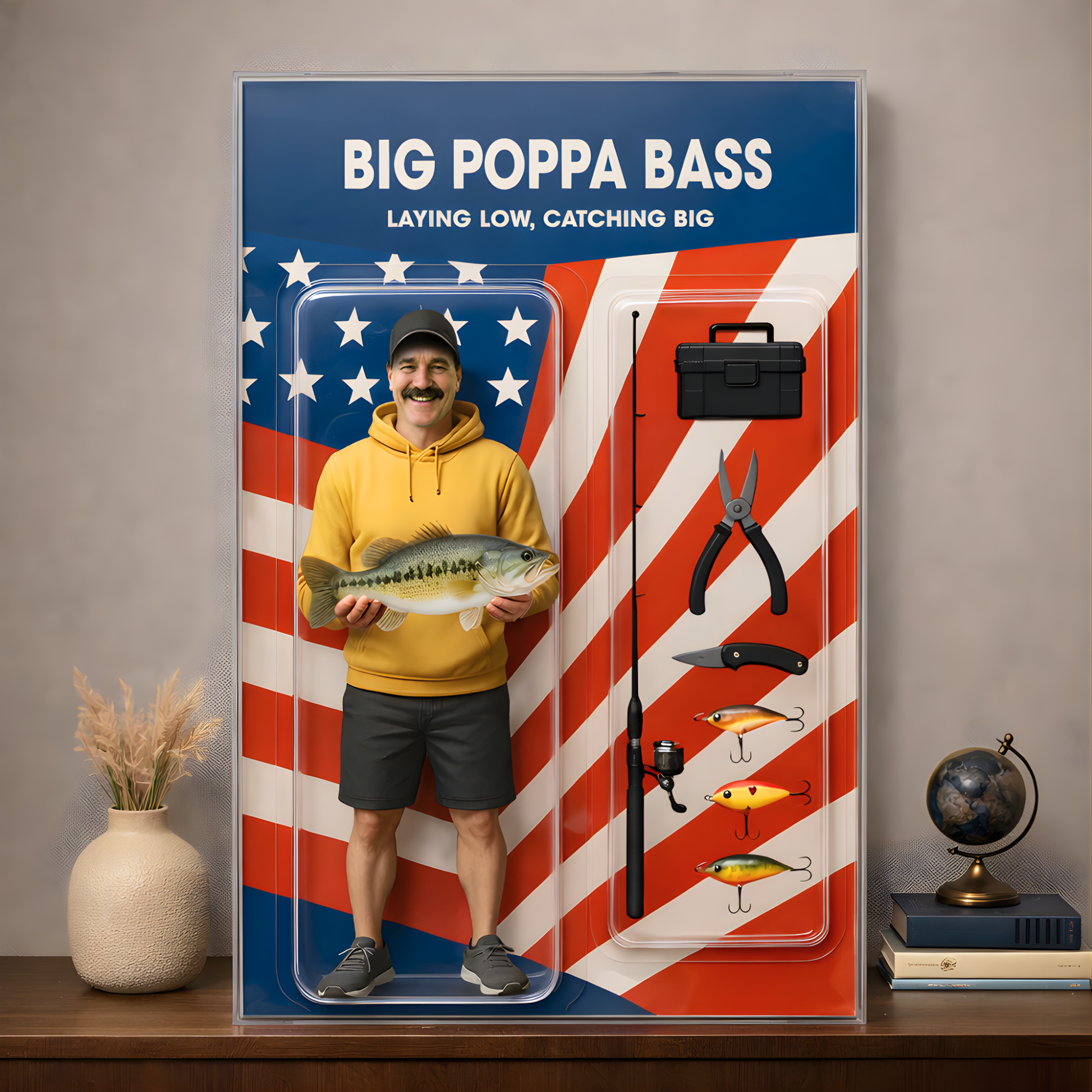 Looking online it appeared to be like an action figure in a package similar to a GI JOE or similar. Once received it looks like a flat piece of acrylic with a picture glued to back. I went back to website and there is a video that shows it from all angles and shows it being flat. I would not have bought if I would of watched video from the start
