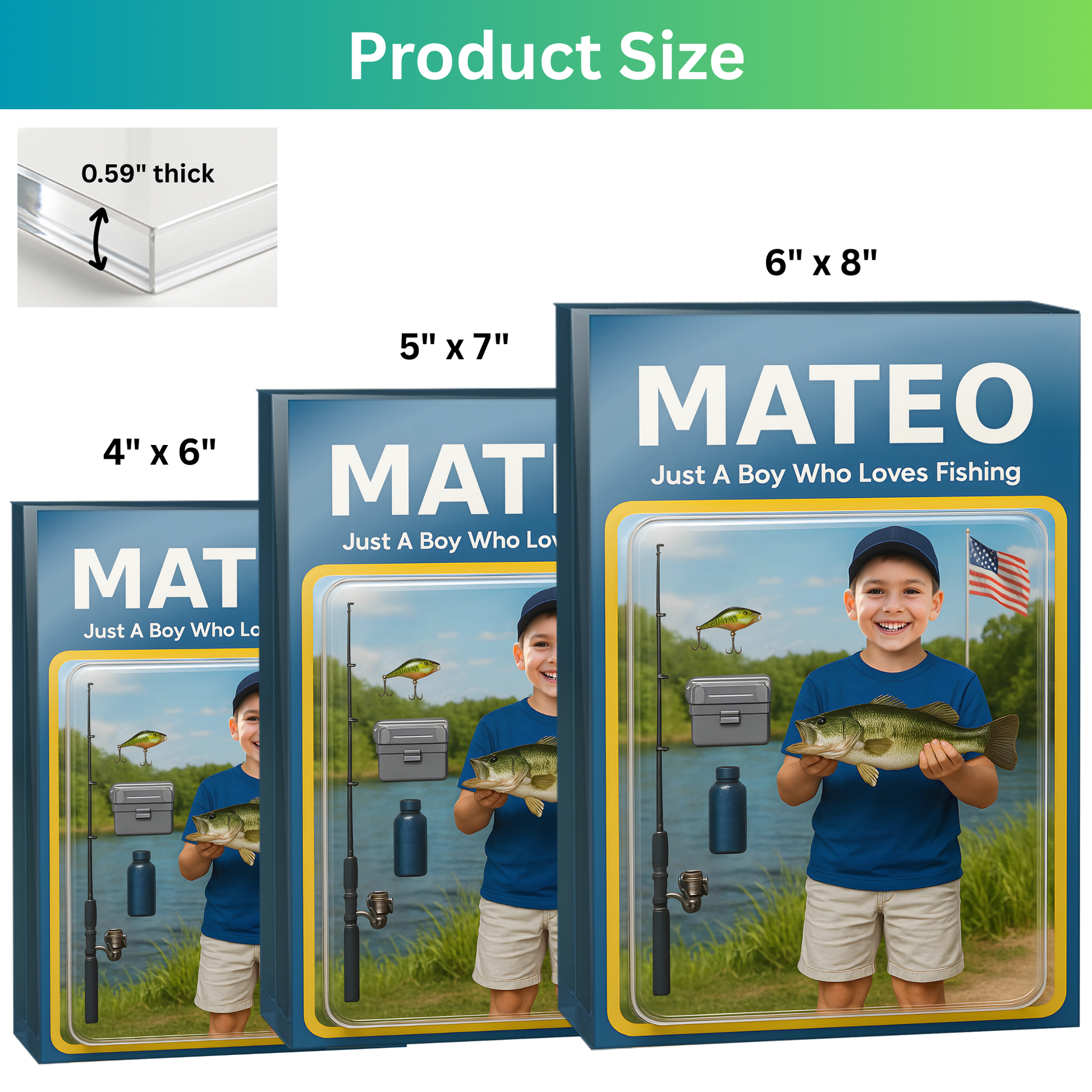 A Boy Loves Fishing - Custom Face & Name Acrylic Plaque