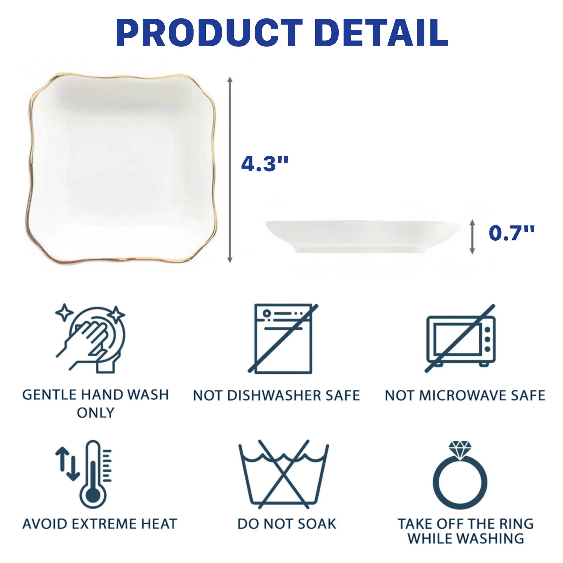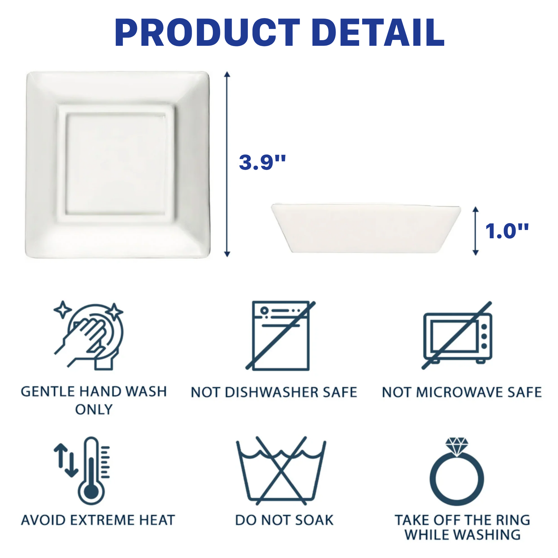 Square Jewelry Dish: 3.9 x 3.9 x 1 inches (~10 x 10 x 2.5 cm).